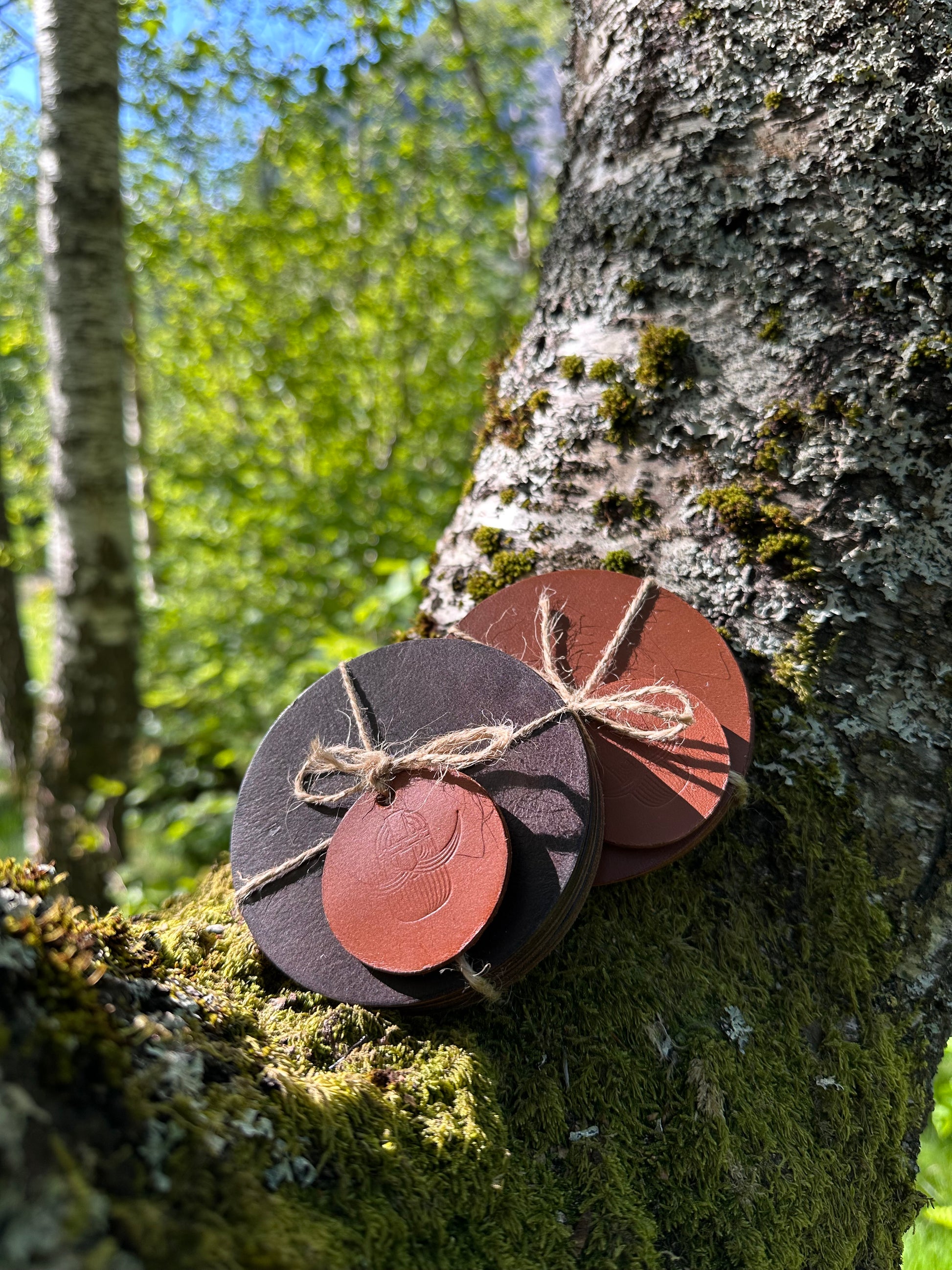 Dette settet med seks håndlagde glassunderlag i lær kombinerer rå nordisk estetikk med funksjonell hverdag. Skåret ut for hånd i tykt, fullnarvet lær – laget for å beskytte bordet og samtidig tilføre karakter og varme til rommet.