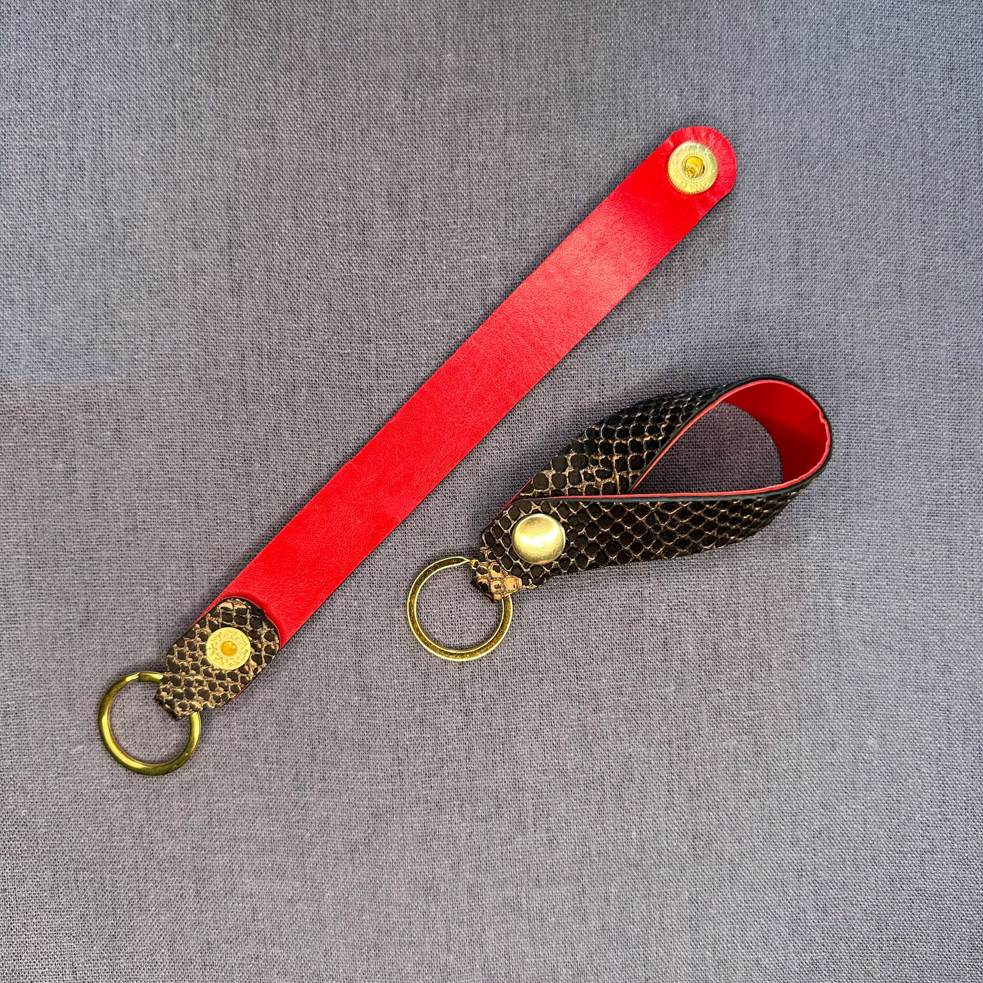 Håndlaget av kraftig skinn med mørk, strukturert overflate og en intens rød innside - som glør under jern.