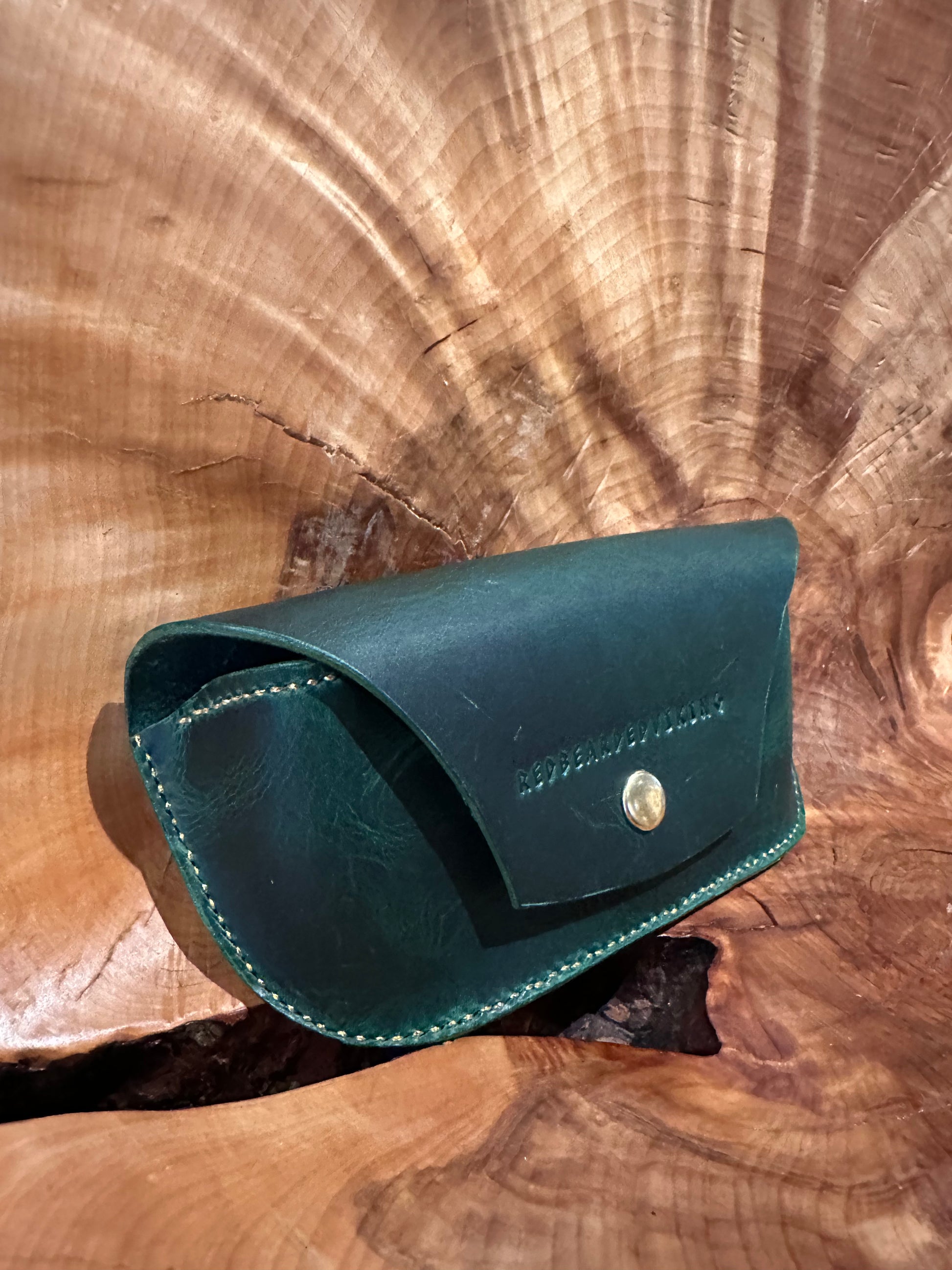 Håndlaget brilleetui i grønt lær av førsteklasses kvalitet.