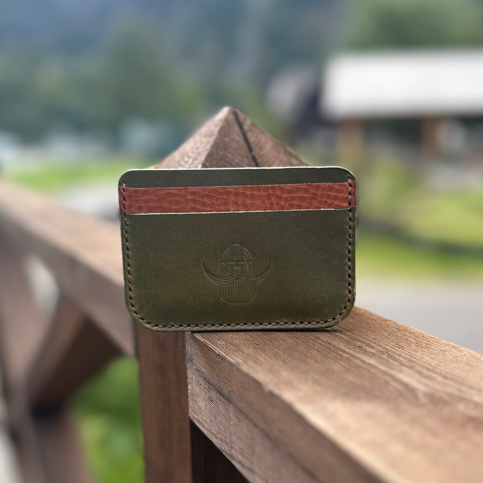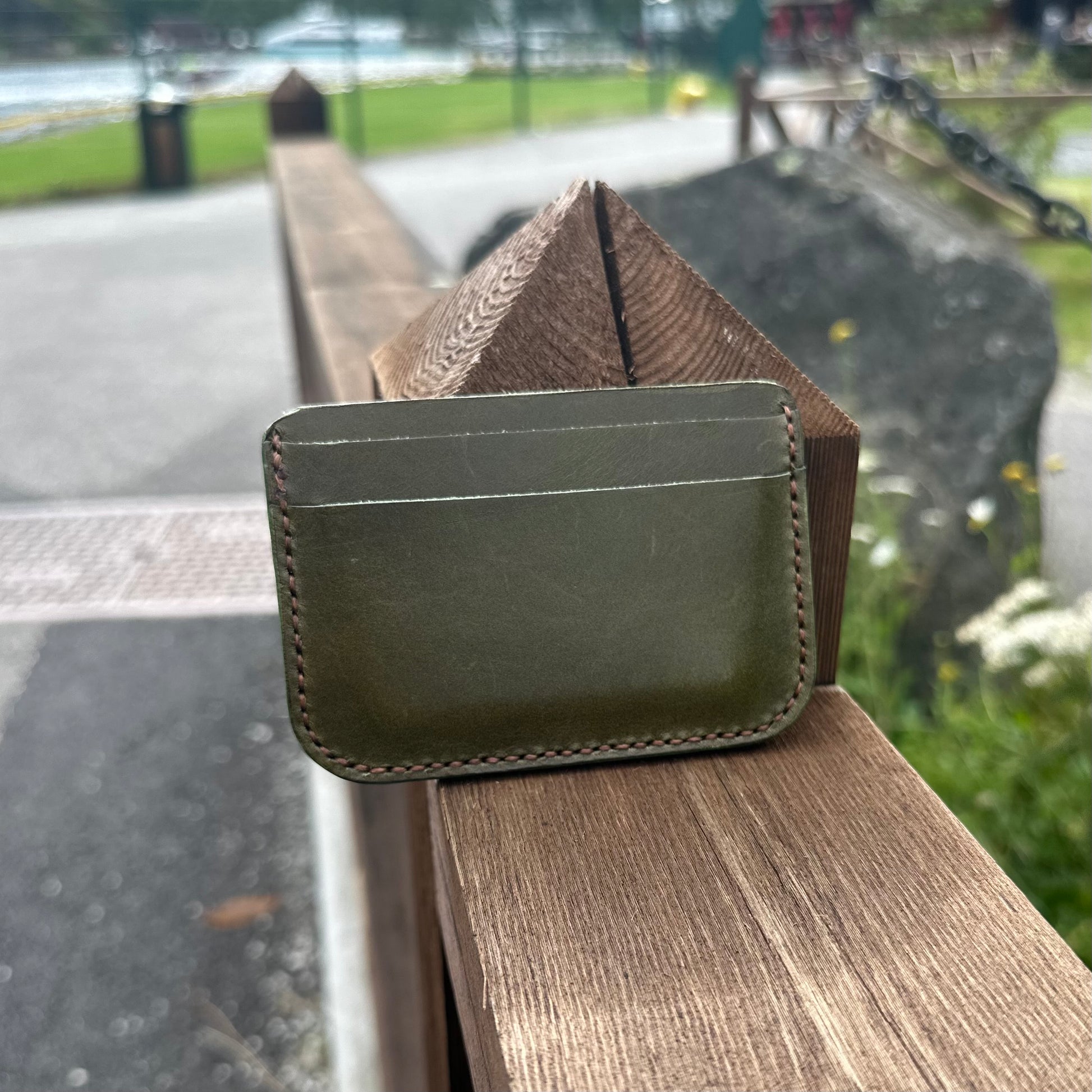 Håndsydd i grønt lær med en varm brun kontrastkant.